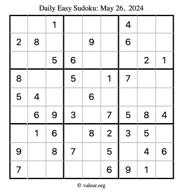 Here is the May 26, 2024 easy sudoku puzzle. You are welcome to print a copy to solve by hand. For your convenience, we have also included the solution further down the page so you can check your work.