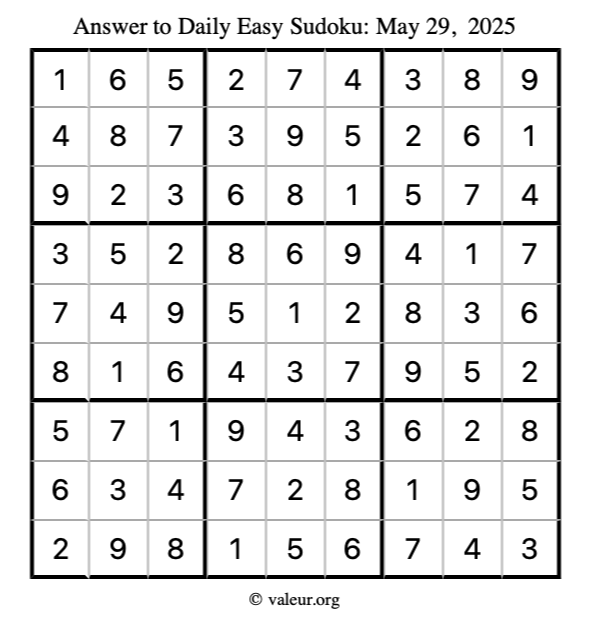Here is the May 29, 2025 easy sudoku puzzle. You are welcome to print a copy to solve by hand. For your convenience, we have also included the solution further down the page so you can check your work.