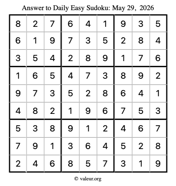 Here is the May 29, 2026 easy sudoku puzzle. You are welcome to print a copy to solve by hand. For your convenience, we have also included the solution further down the page so you can check your work.