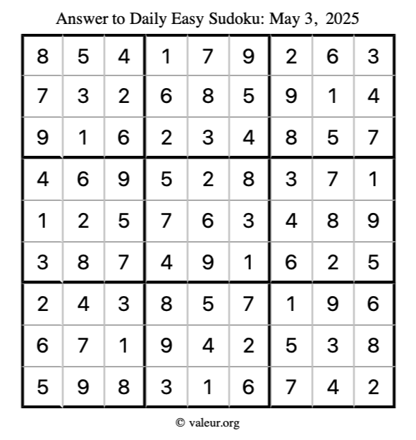 Here is the May 3, 2025 easy sudoku puzzle. You are welcome to print a copy to solve by hand. For your convenience, we have also included the solution further down the page so you can check your work.