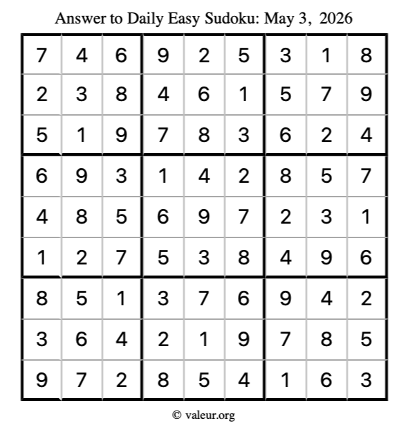 As promised, here is the solution to the May 3, 2026 easy sudoku puzzle:
