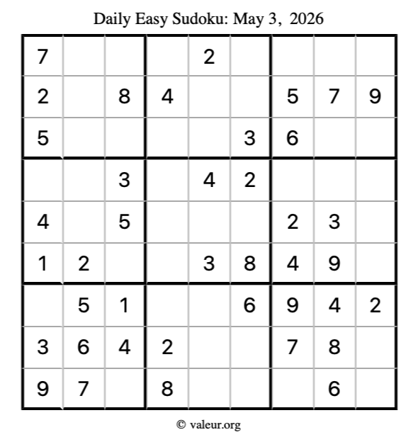 Here is the May 3, 2026 easy sudoku puzzle. You are welcome to print a copy to solve by hand. For your convenience, we have also included the solution further down the page so you can check your work.
