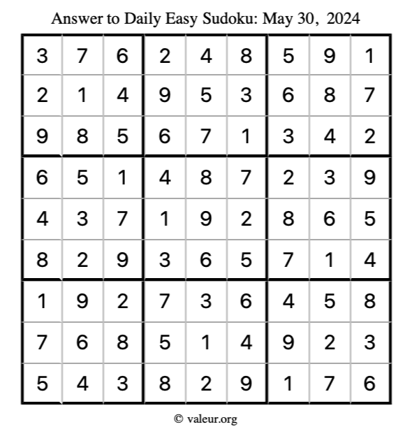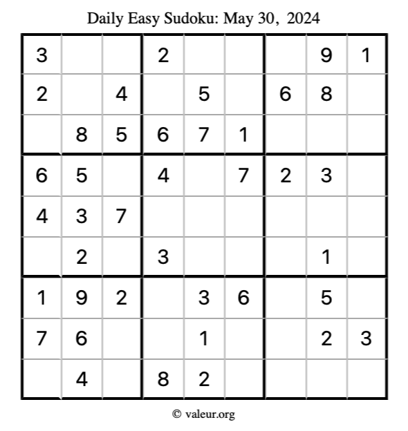 Here is the May 30, 2024 easy sudoku puzzle. You are welcome to print a copy to solve by hand. For your convenience, we have also included the solution further down the page so you can check your work.