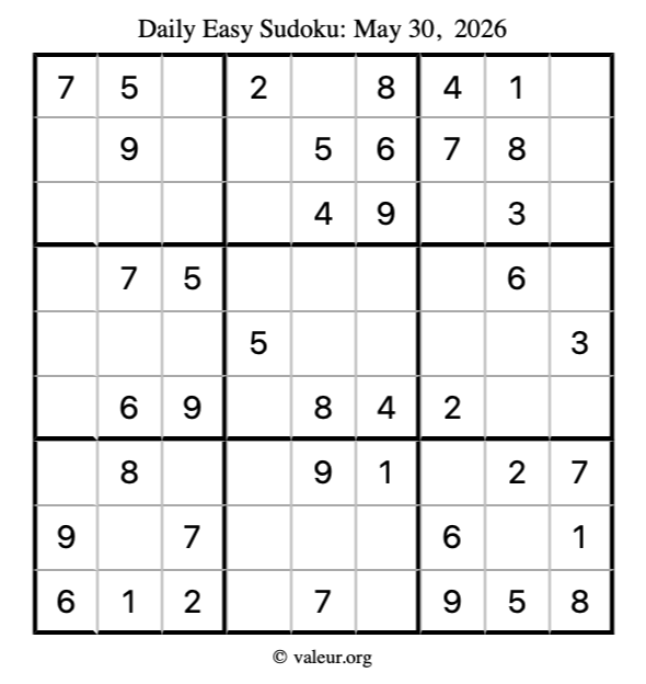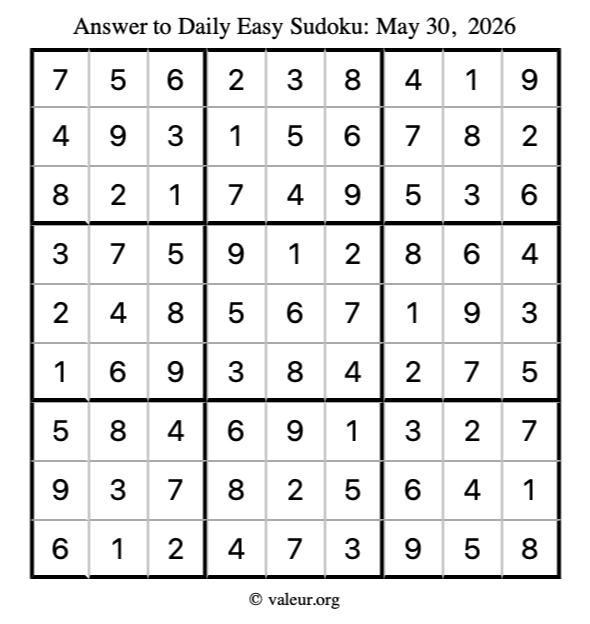 Here is the May 30, 2026 easy sudoku puzzle. You are welcome to print a copy to solve by hand. For your convenience, we have also included the solution further down the page so you can check your work.