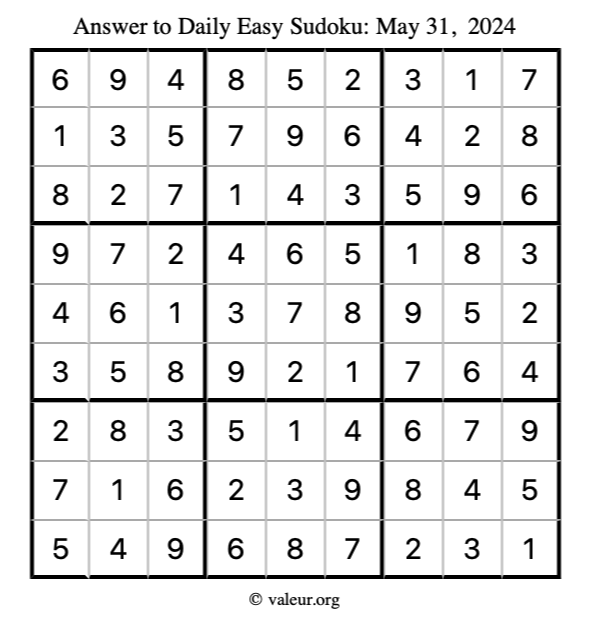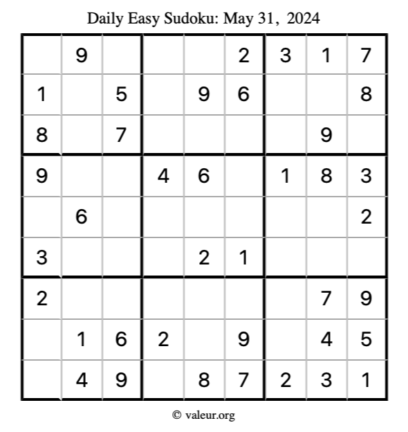 Here is the May 31, 2024 easy sudoku puzzle. You are welcome to print a copy to solve by hand. For your convenience, we have also included the solution further down the page so you can check your work.