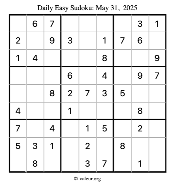 Here is the May 31, 2025 easy sudoku puzzle. You are welcome to print a copy to solve by hand. For your convenience, we have also included the solution further down the page so you can check your work.