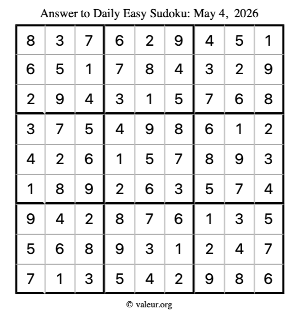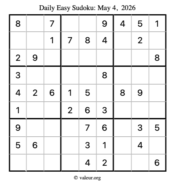 Here is the May 4, 2026 easy sudoku puzzle. You are welcome to print a copy to solve by hand. For your convenience, we have also included the solution further down the page so you can check your work.