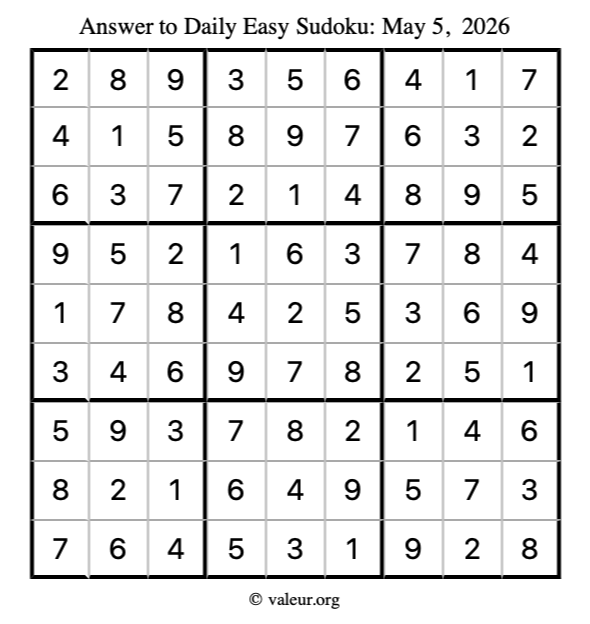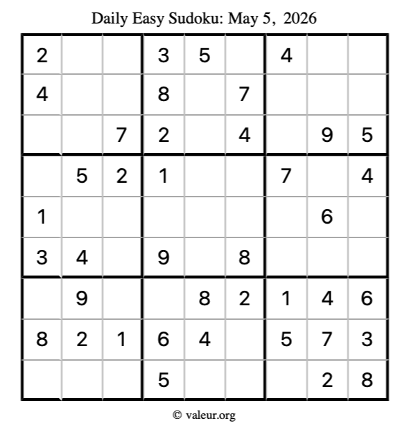 Here is the May 5, 2026 easy sudoku puzzle. You are welcome to print a copy to solve by hand. For your convenience, we have also included the solution further down the page so you can check your work.