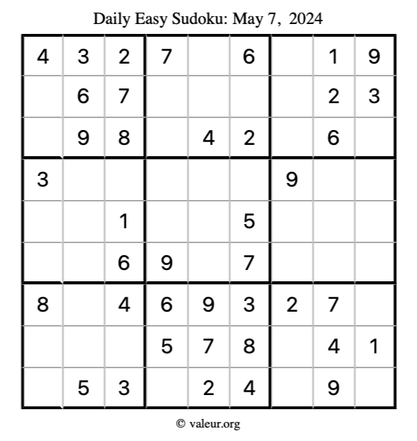 Here is the May 7, 2024 easy sudoku puzzle. You are welcome to print a copy to solve by hand. For your convenience, we have also included the solution further down the page so you can check your work.