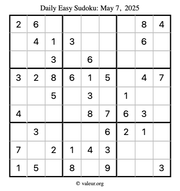 Here is the May 7, 2025 easy sudoku puzzle. You are welcome to print a copy to solve by hand. For your convenience, we have also included the solution further down the page so you can check your work.