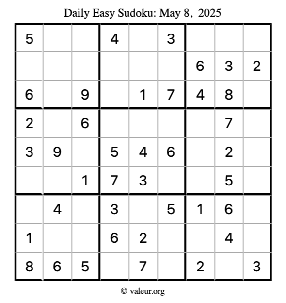 Here is the May 8, 2025 easy sudoku puzzle. You are welcome to print a copy to solve by hand. For your convenience, we have also included the solution further down the page so you can check your work.