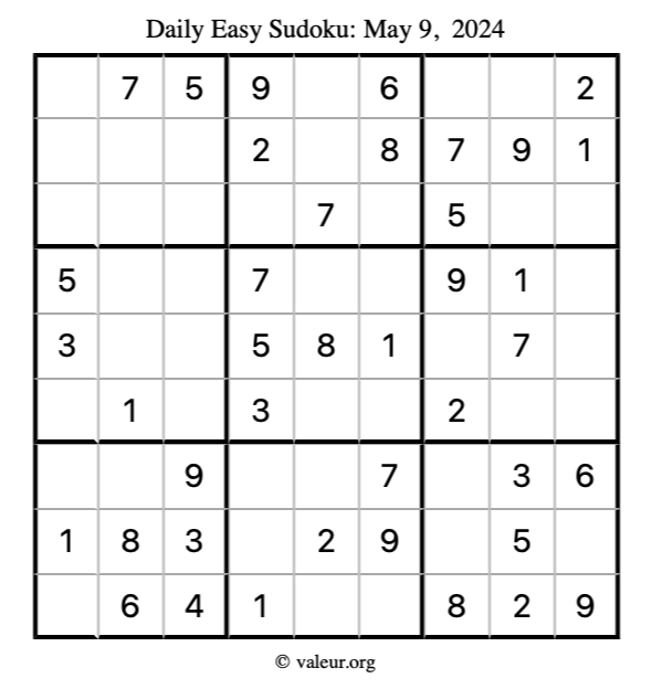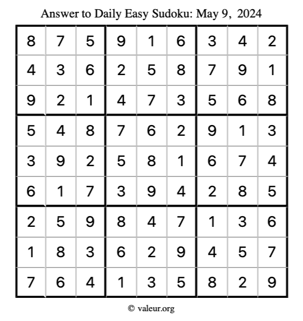 Here is the May 9, 2024 easy sudoku puzzle. You are welcome to print a copy to solve by hand. For your convenience, we have also included the solution further down the page so you can check your work.