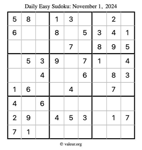 Here is the November 1, 2024 easy sudoku puzzle. You are welcome to print a copy to solve by hand. For your convenience, we have also included the solution further down the page so you can check your work.