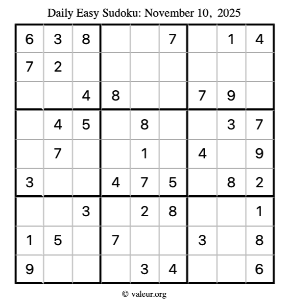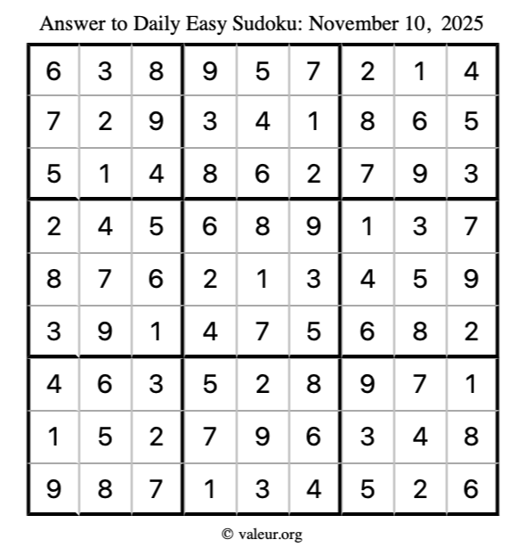 Here is the November 10, 2025 easy sudoku puzzle. You are welcome to print a copy to solve by hand. For your convenience, we have also included the solution further down the page so you can check your work.