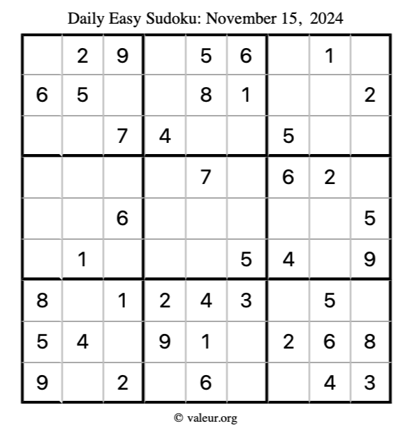 Here is the November 15, 2024 easy sudoku puzzle. You are welcome to print a copy to solve by hand. For your convenience, we have also included the solution further down the page so you can check your work.