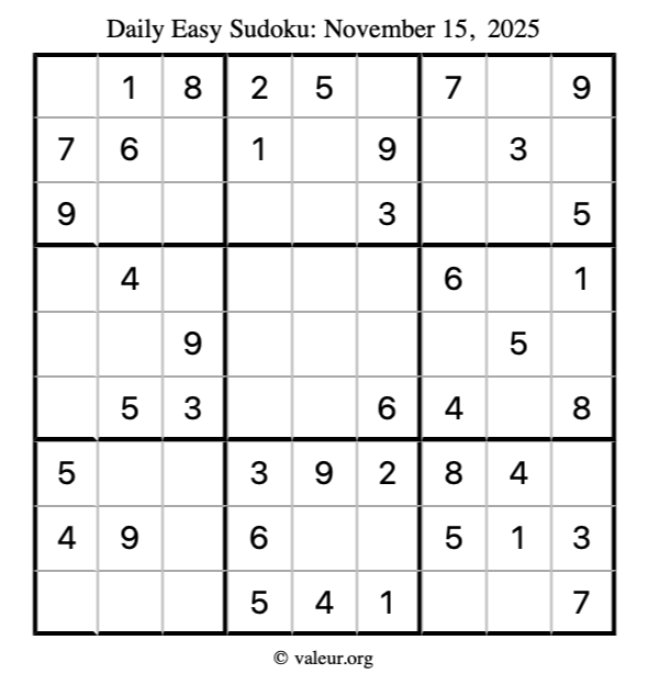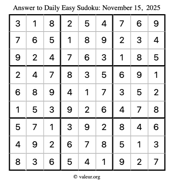 Here is the November 15, 2025 easy sudoku puzzle. You are welcome to print a copy to solve by hand. For your convenience, we have also included the solution further down the page so you can check your work.