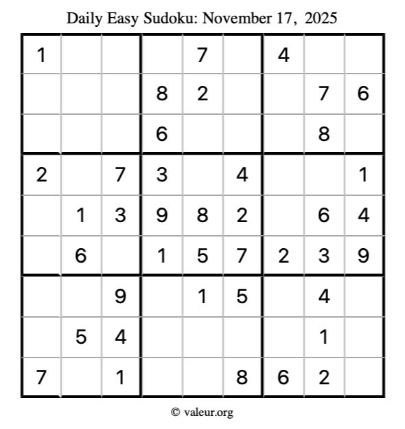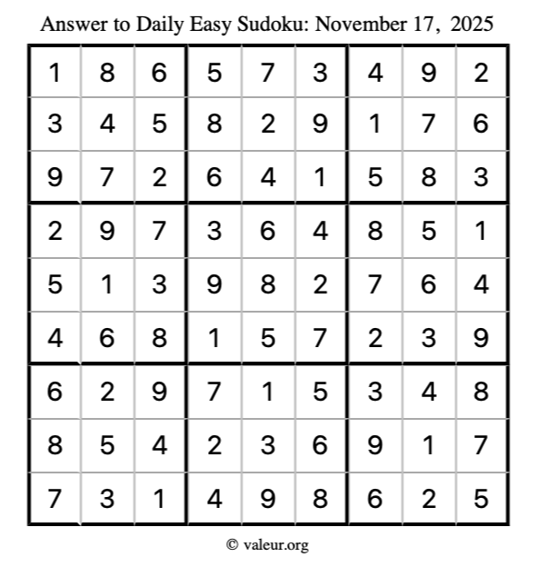 Here is the November 17, 2025 easy sudoku puzzle. You are welcome to print a copy to solve by hand. For your convenience, we have also included the solution further down the page so you can check your work.