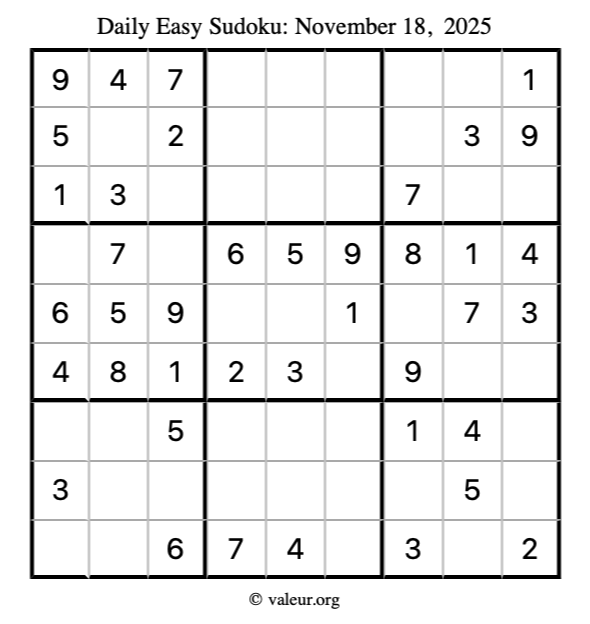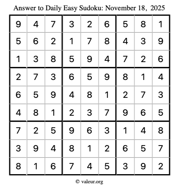 Here is the November 18, 2025 easy sudoku puzzle. You are welcome to print a copy to solve by hand. For your convenience, we have also included the solution further down the page so you can check your work.