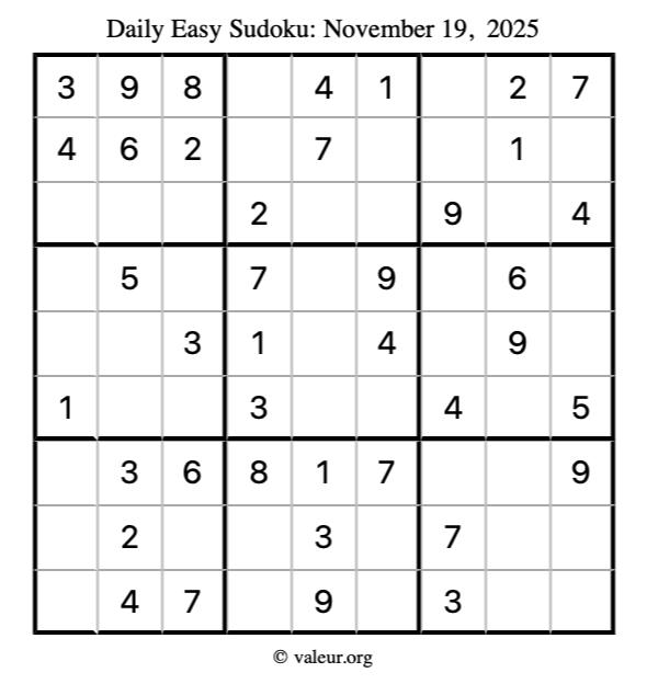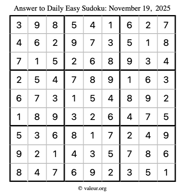 Here is the November 19, 2025 easy sudoku puzzle. You are welcome to print a copy to solve by hand. For your convenience, we have also included the solution further down the page so you can check your work.