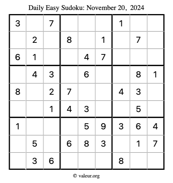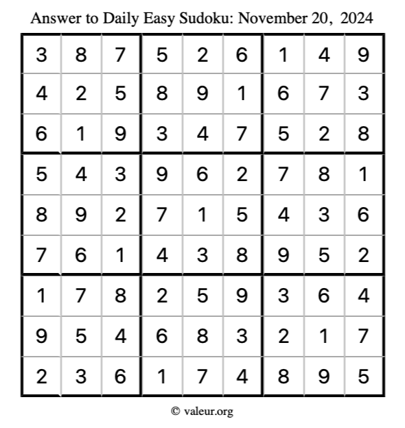 Here is the November 20, 2024 easy sudoku puzzle. You are welcome to print a copy to solve by hand. For your convenience, we have also included the solution further down the page so you can check your work.