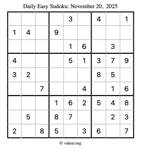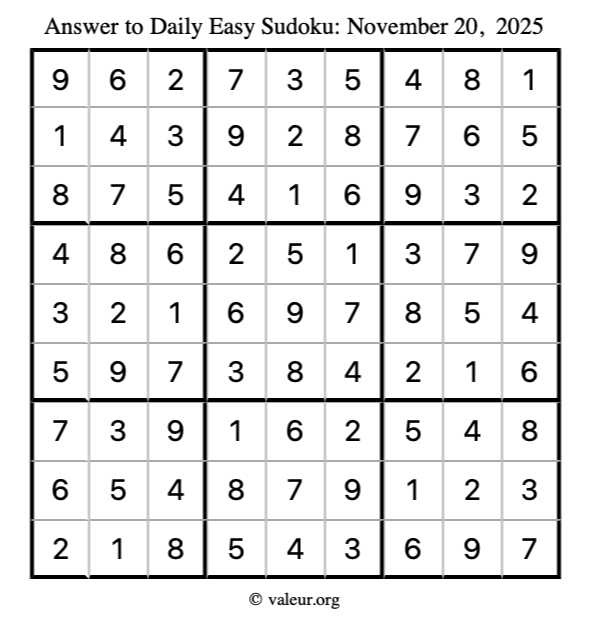Here is the November 20, 2025 easy sudoku puzzle. You are welcome to print a copy to solve by hand. For your convenience, we have also included the solution further down the page so you can check your work.