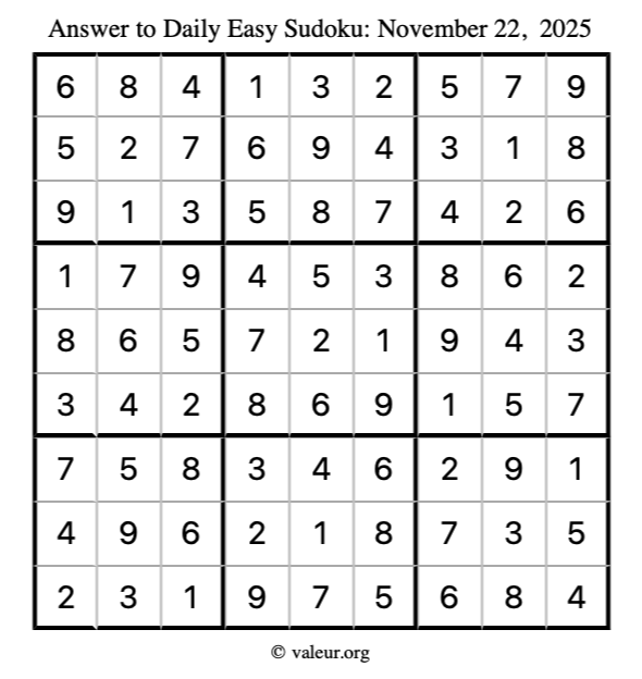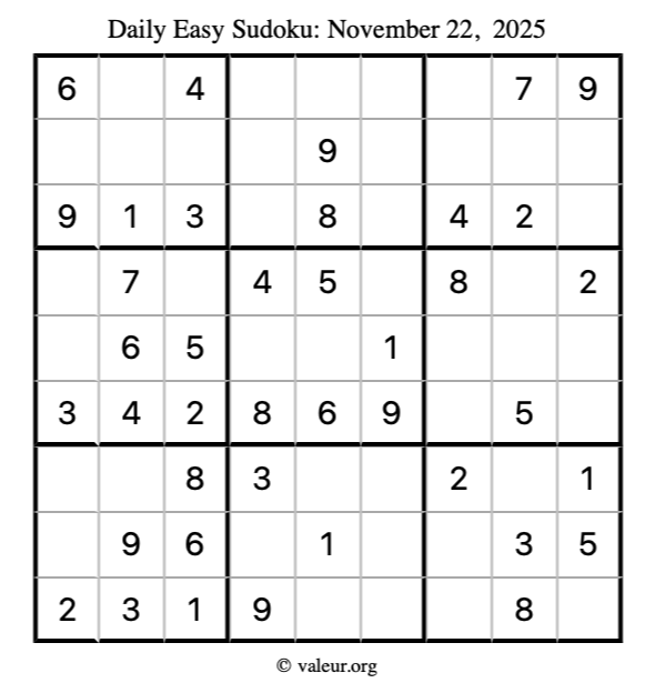 Here is the November 22, 2025 easy sudoku puzzle. You are welcome to print a copy to solve by hand. For your convenience, we have also included the solution further down the page so you can check your work.
