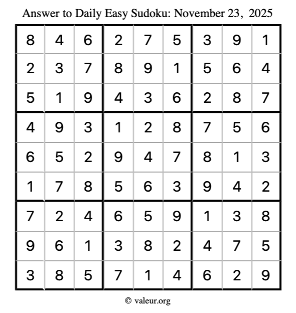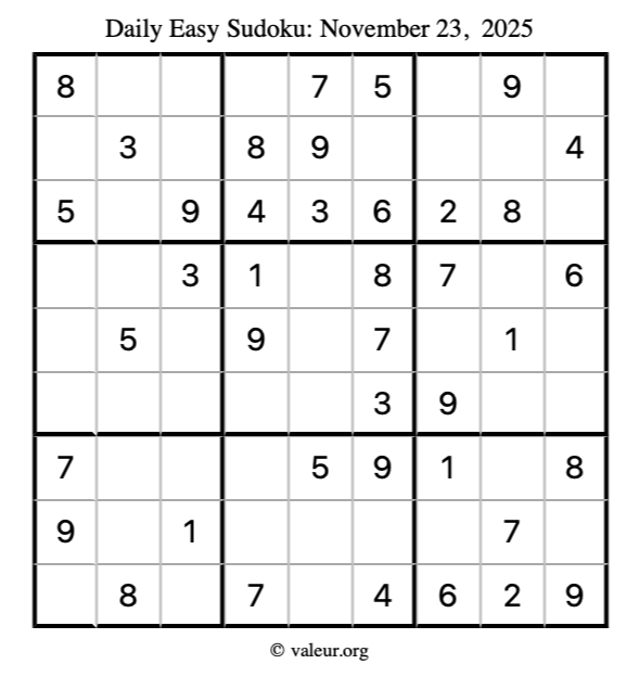 Here is the November 23, 2025 easy sudoku puzzle. You are welcome to print a copy to solve by hand. For your convenience, we have also included the solution further down the page so you can check your work.