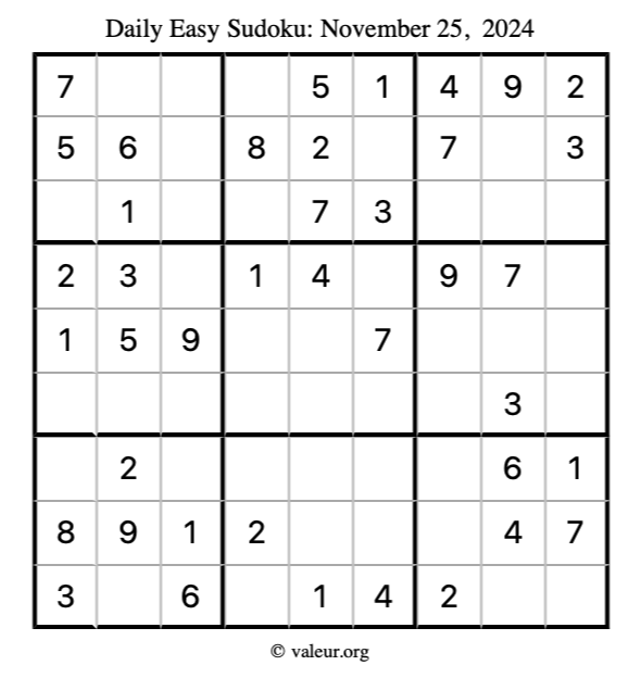Here is the November 25, 2024 easy sudoku puzzle. You are welcome to print a copy to solve by hand. For your convenience, we have also included the solution further down the page so you can check your work.