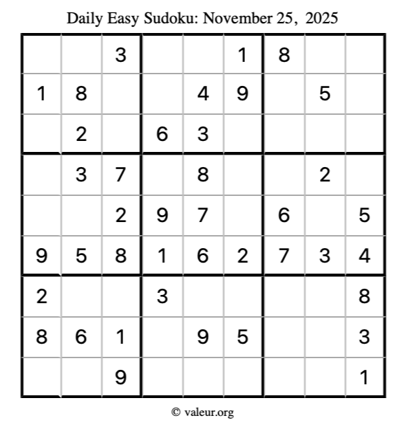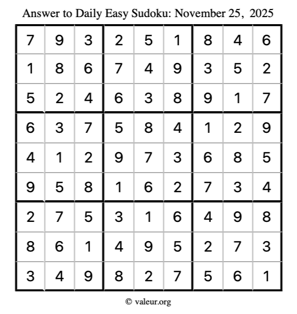 Here is the November 25, 2025 easy sudoku puzzle. You are welcome to print a copy to solve by hand. For your convenience, we have also included the solution further down the page so you can check your work.