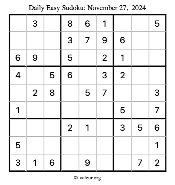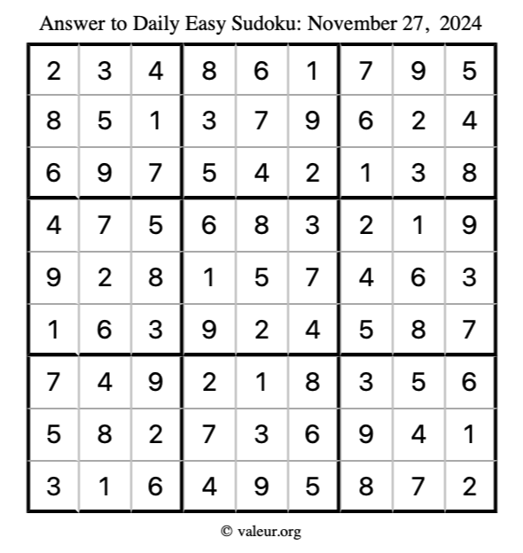 Here is the November 27, 2024 easy sudoku puzzle. You are welcome to print a copy to solve by hand. For your convenience, we have also included the solution further down the page so you can check your work.