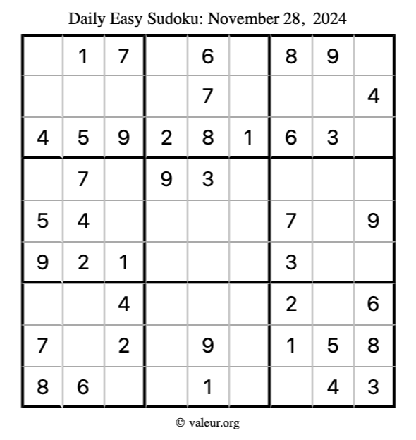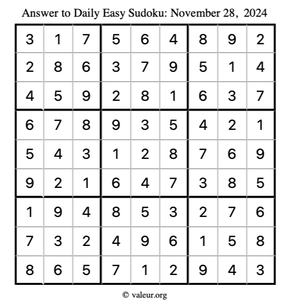 Here is the November 28, 2024 easy sudoku puzzle. You are welcome to print a copy to solve by hand. For your convenience, we have also included the solution further down the page so you can check your work.