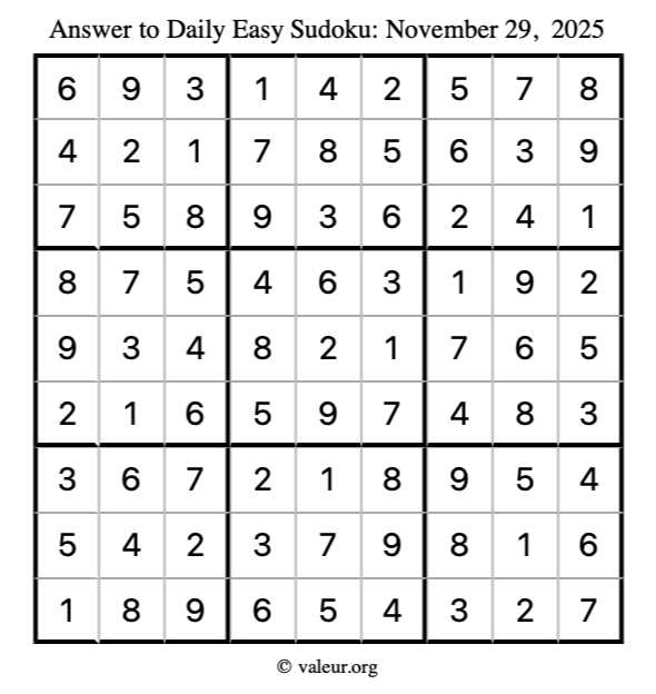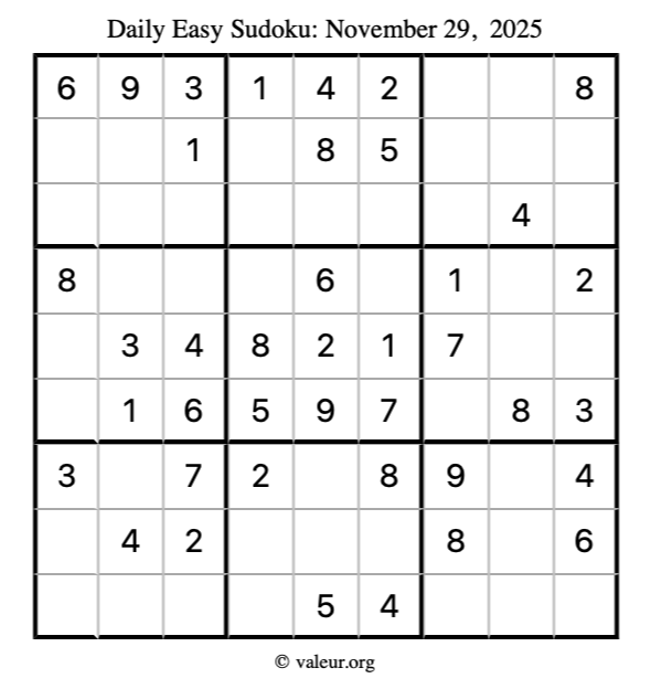Here is the November 29, 2025 easy sudoku puzzle. You are welcome to print a copy to solve by hand. For your convenience, we have also included the solution further down the page so you can check your work.