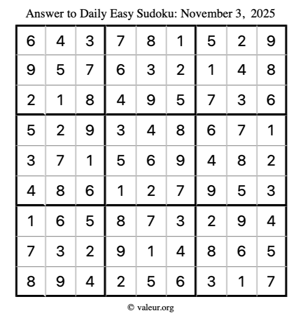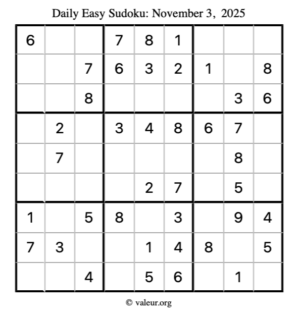 Here is the November 3, 2025 easy sudoku puzzle. You are welcome to print a copy to solve by hand. For your convenience, we have also included the solution further down the page so you can check your work.