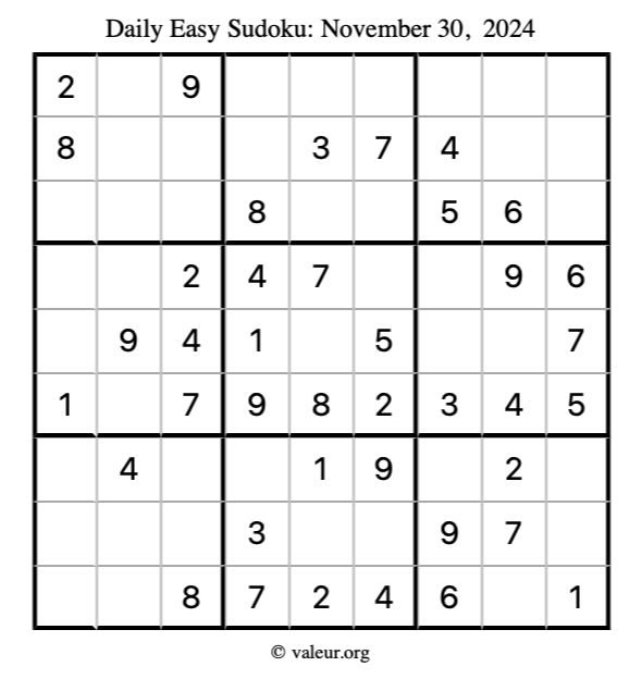 Here is the November 30, 2024 easy sudoku puzzle. You are welcome to print a copy to solve by hand. For your convenience, we have also included the solution further down the page so you can check your work.