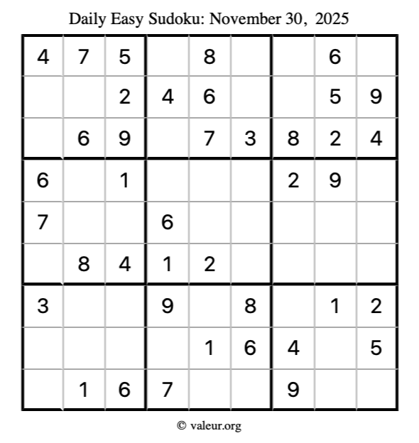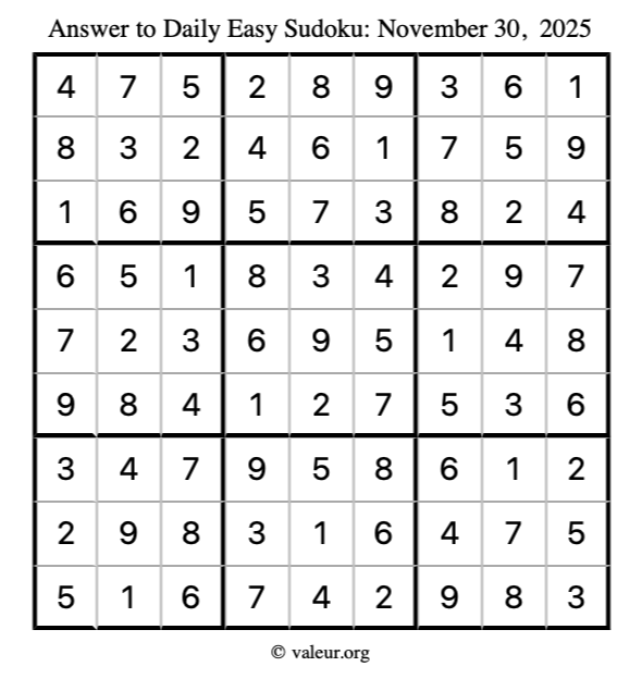 Here is the November 30, 2025 easy sudoku puzzle. You are welcome to print a copy to solve by hand. For your convenience, we have also included the solution further down the page so you can check your work.