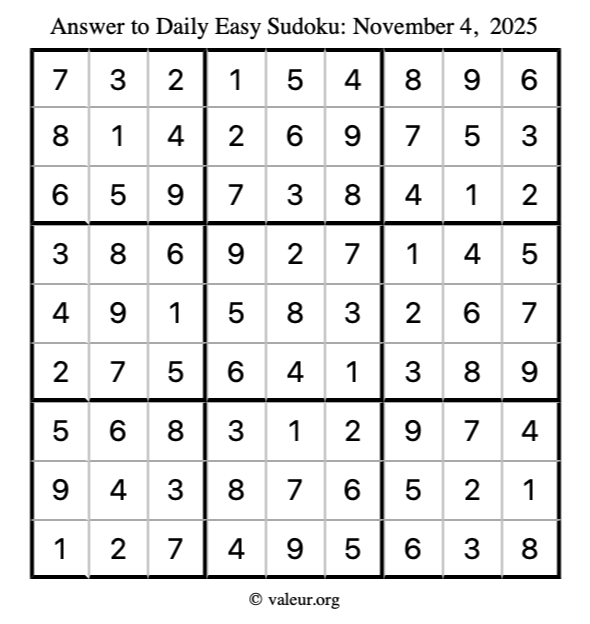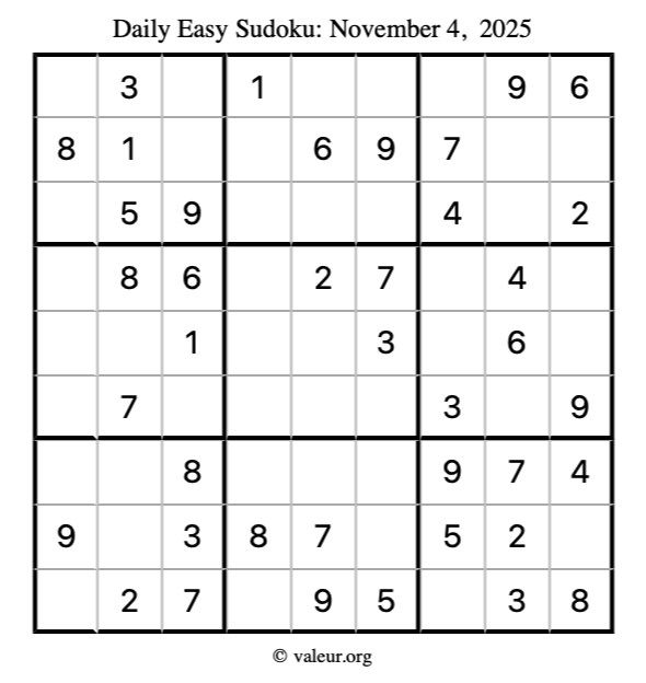 Here is the November 4, 2025 easy sudoku puzzle. You are welcome to print a copy to solve by hand. For your convenience, we have also included the solution further down the page so you can check your work.