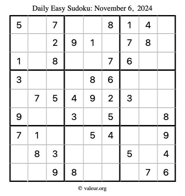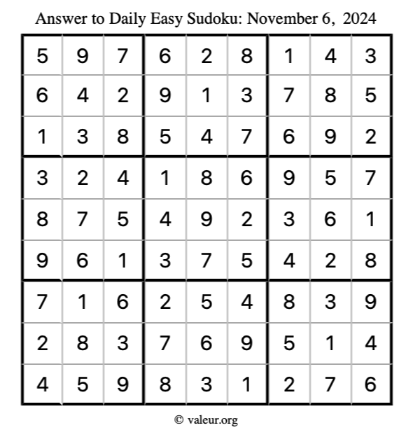 Here is the November 6, 2024 easy sudoku puzzle. You are welcome to print a copy to solve by hand. For your convenience, we have also included the solution further down the page so you can check your work.