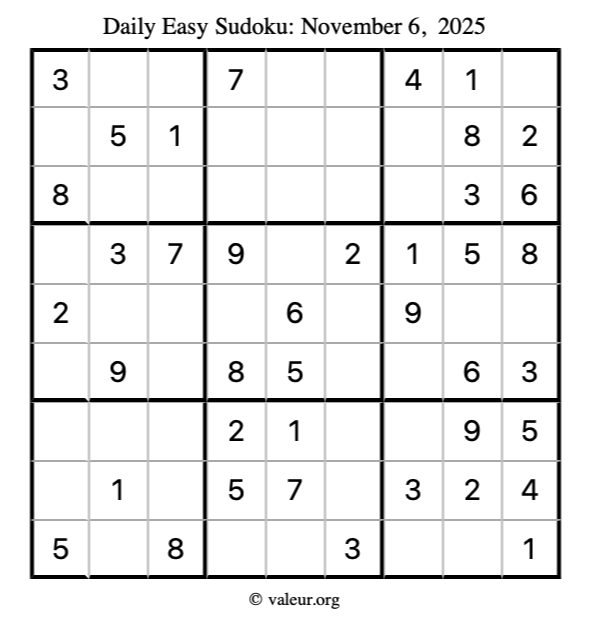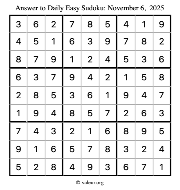 Here is the November 6, 2025 easy sudoku puzzle. You are welcome to print a copy to solve by hand. For your convenience, we have also included the solution further down the page so you can check your work.