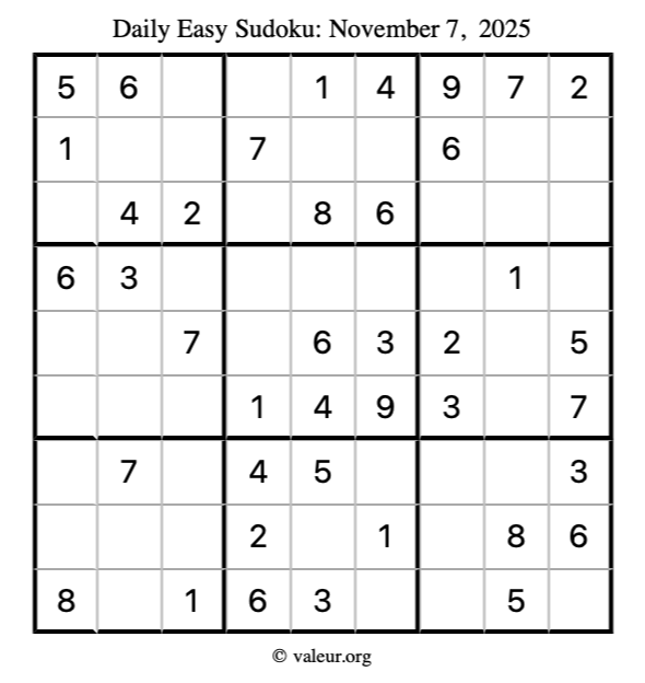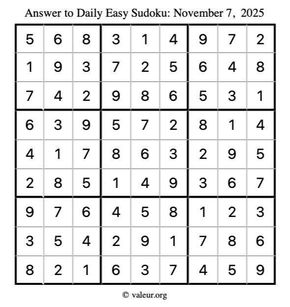 Here is the November 7, 2025 easy sudoku puzzle. You are welcome to print a copy to solve by hand. For your convenience, we have also included the solution further down the page so you can check your work.