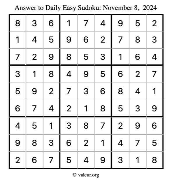 Here is the November 8, 2024 easy sudoku puzzle. You are welcome to print a copy to solve by hand. For your convenience, we have also included the solution further down the page so you can check your work.