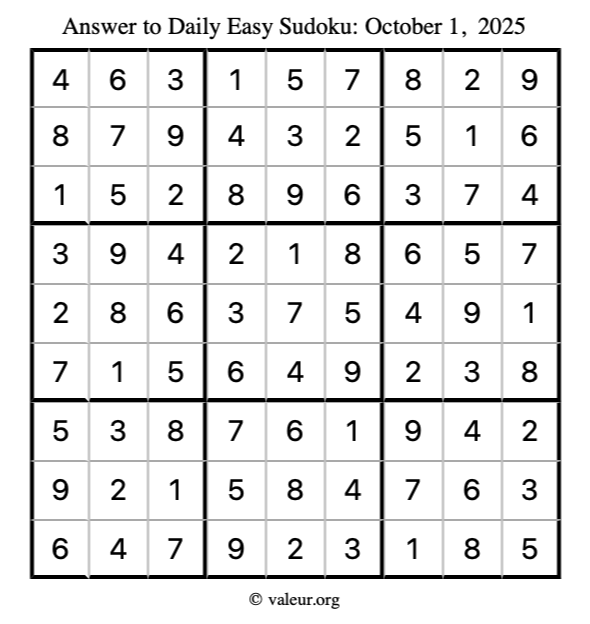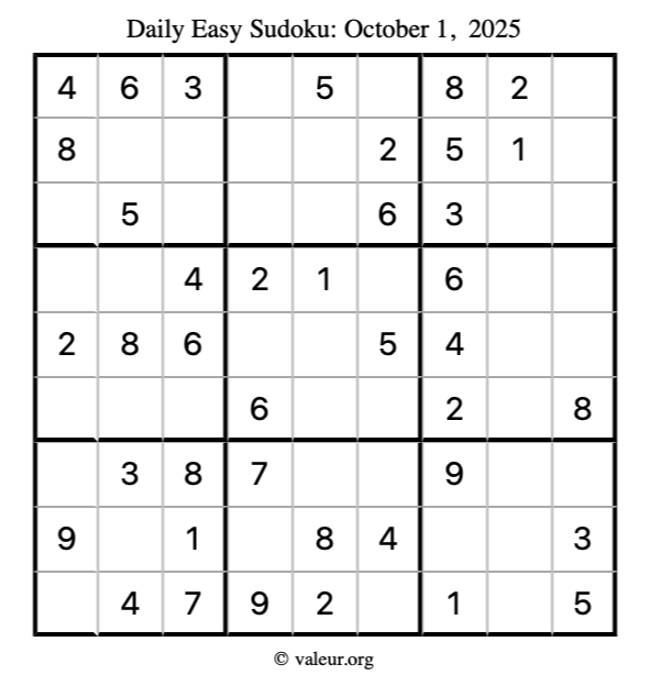 Here is the October 1, 2025 easy sudoku puzzle. You are welcome to print a copy to solve by hand. For your convenience, we have also included the solution further down the page so you can check your work.