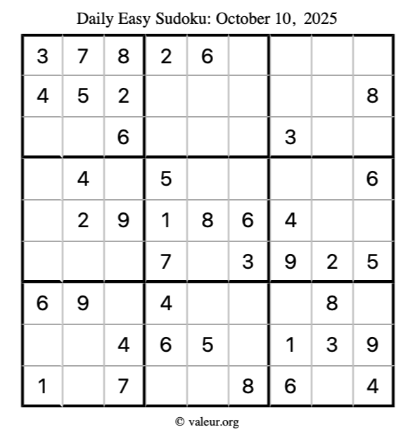 Here is the October 10, 2025 easy sudoku puzzle. You are welcome to print a copy to solve by hand. For your convenience, we have also included the solution further down the page so you can check your work.