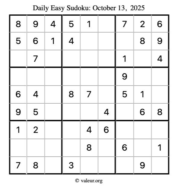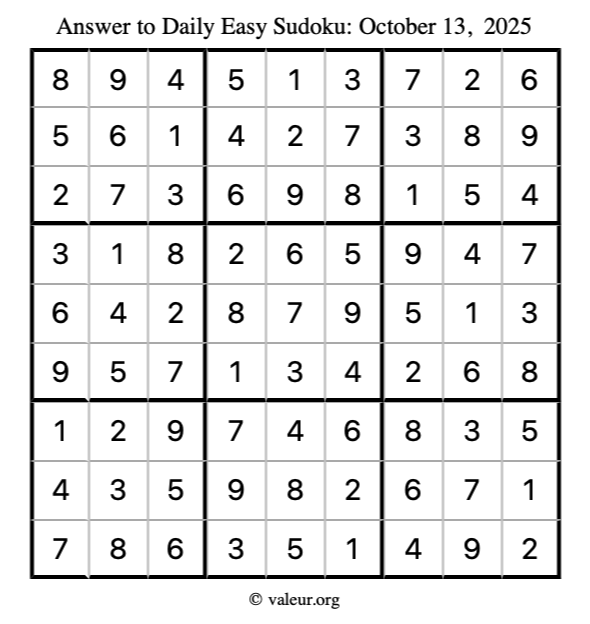 Here is the October 13, 2025 easy sudoku puzzle. You are welcome to print a copy to solve by hand. For your convenience, we have also included the solution further down the page so you can check your work.