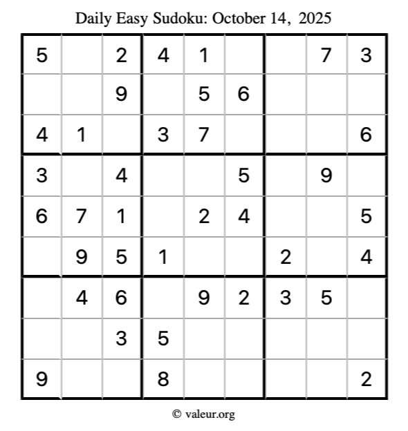 Here is the October 14, 2025 easy sudoku puzzle. You are welcome to print a copy to solve by hand. For your convenience, we have also included the solution further down the page so you can check your work.