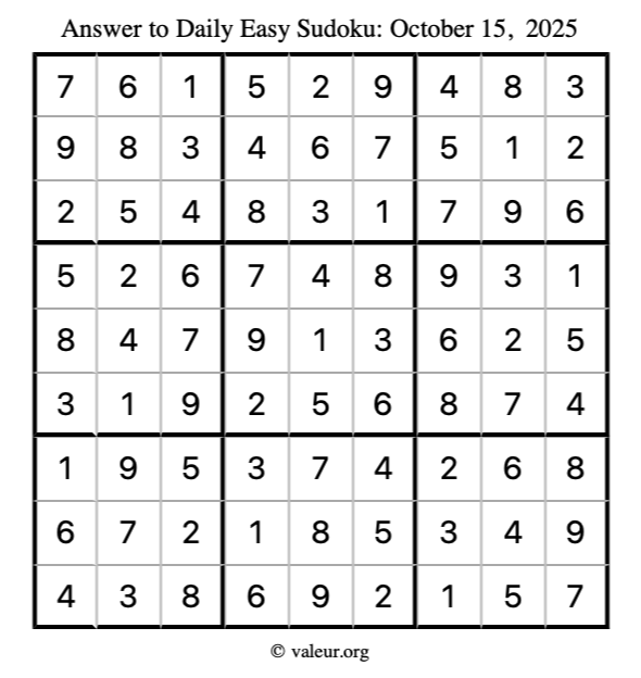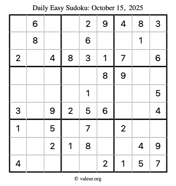 Here is the October 15, 2025 easy sudoku puzzle. You are welcome to print a copy to solve by hand. For your convenience, we have also included the solution further down the page so you can check your work.