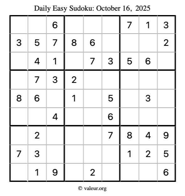 Here is the October 16, 2025 easy sudoku puzzle. You are welcome to print a copy to solve by hand. For your convenience, we have also included the solution further down the page so you can check your work.