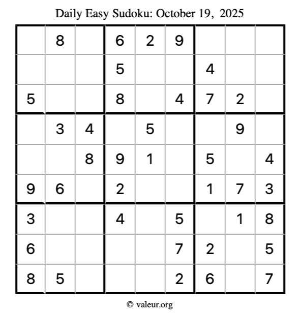 Here is the October 19, 2025 easy sudoku puzzle. You are welcome to print a copy to solve by hand. For your convenience, we have also included the solution further down the page so you can check your work.