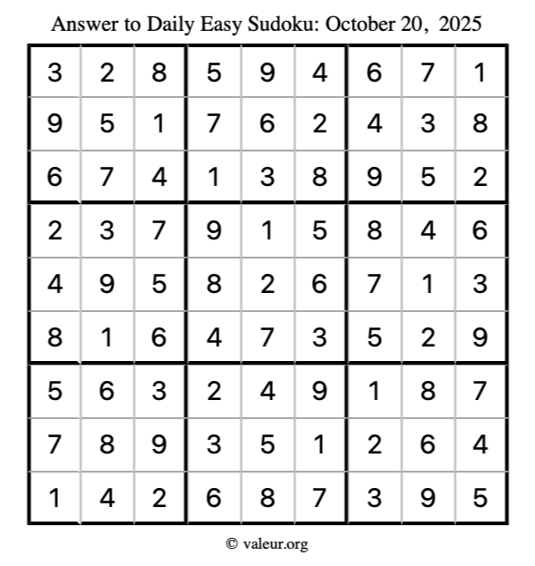 Here is the October 20, 2025 easy sudoku puzzle. You are welcome to print a copy to solve by hand. For your convenience, we have also included the solution further down the page so you can check your work.