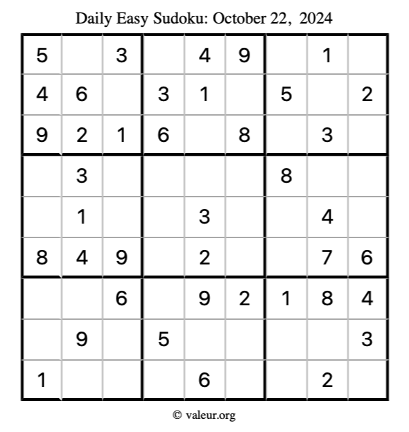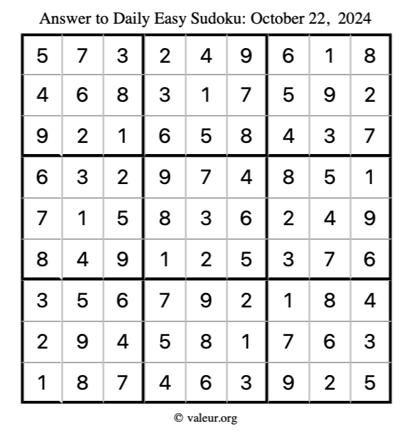 Here is the October 22, 2024 easy sudoku puzzle. You are welcome to print a copy to solve by hand. For your convenience, we have also included the solution further down the page so you can check your work.