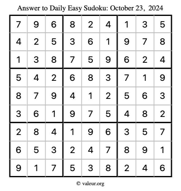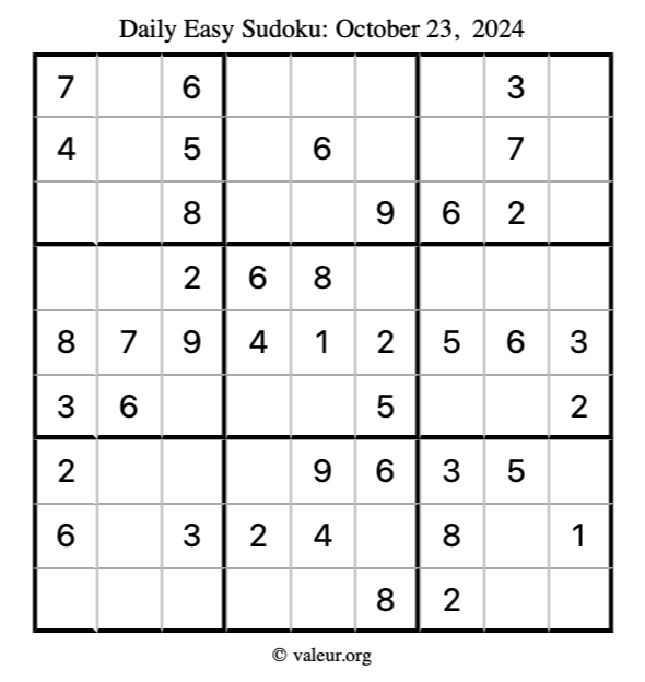 Here is the October 23, 2024 easy sudoku puzzle. You are welcome to print a copy to solve by hand. For your convenience, we have also included the solution further down the page so you can check your work.